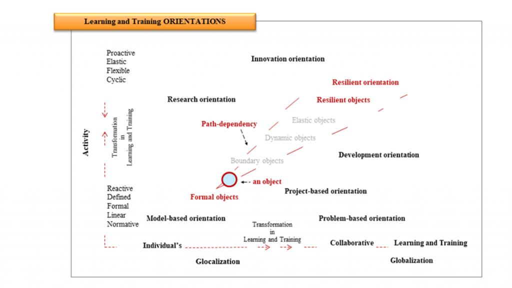This analysis enhanced the understanding of curriculum, module, and syllabus design, highlighting the need for flexibility, mutability, elasticity, and resilience. These qualities are valuable for training and learning processes, both in the actualization of study units and training courses through their adaptable nature, and in supporting alternative learning paths and support to creativity. This is especially important for integrating students into international R&D&IA themes and preparing them to learn in response to global and national shifts and unexpected targets. The “elastic nature” of training and learning objectives contributes to improvements in satisfaction, atmosphere, mutual trust, confidence, and attitudes toward learning. The complexity of training and learning orientations and pathways is illustrated below.